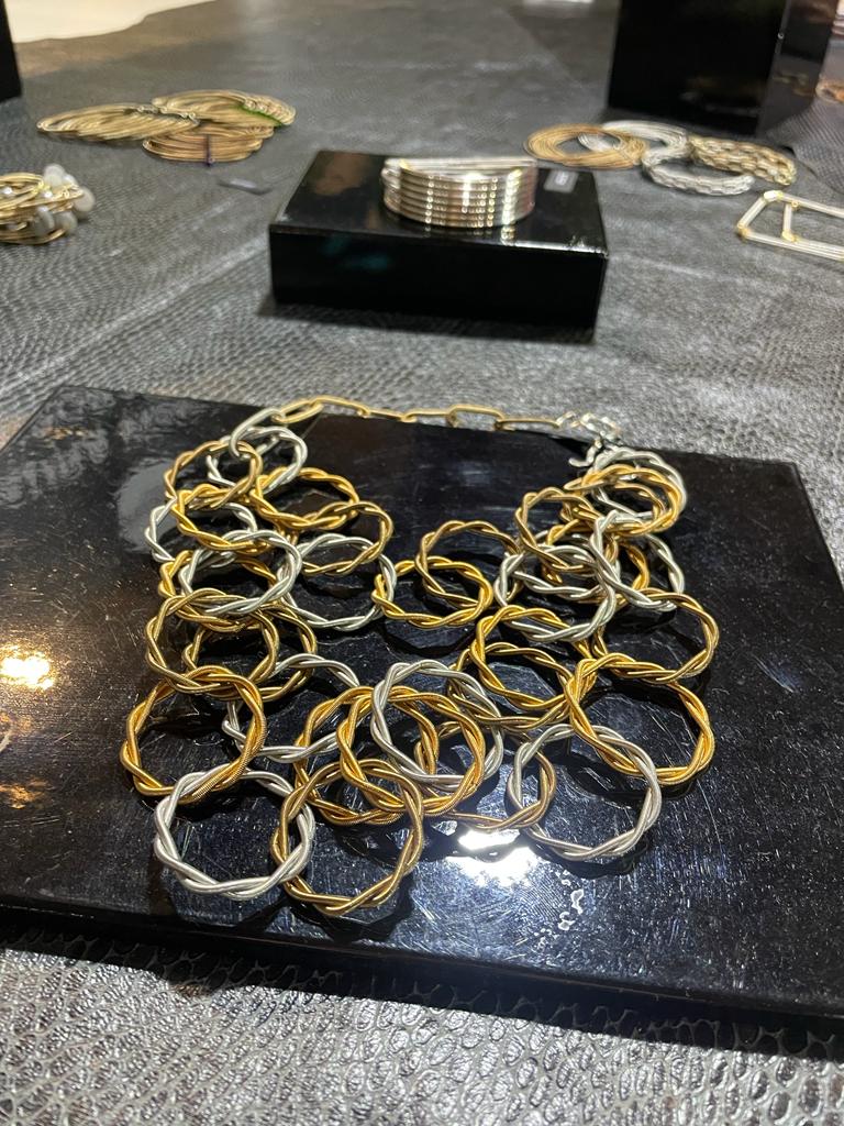 Quando mi sono avvicinata all’espositore di Laura Visentin, ho notato dei bracciali realizzati con materiali molto particolari, che ad un primo sguardo mi sembravano di metallo rigido. Una volta presi in mano, sono rimasta sorpresa poiché non erano affatto rigidi, piuttosto erano elastici. Anzi, ancora più precisamente erano molle.