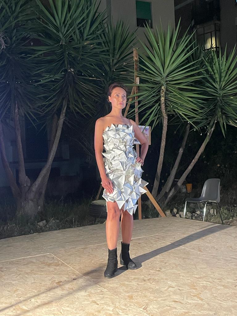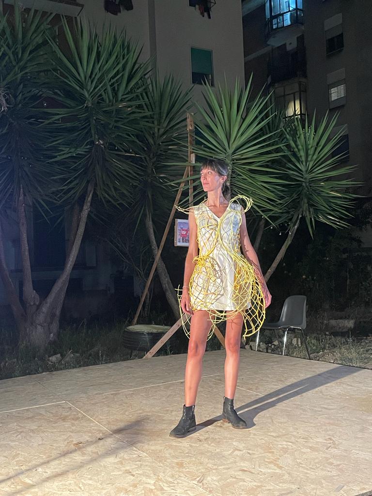 A conclusione della sfilata non potevano mancare originali abiti creati con materiali riciclati: un abito interamente in plastica recuperata e un altro realizzato con materiali di consumo per la casa (come il filo per il taglia siepi). Un invito alla responsabilità e al consumo consapevole: ecco come l’innovazione nella moda contribuirà a dare forma al futuro.